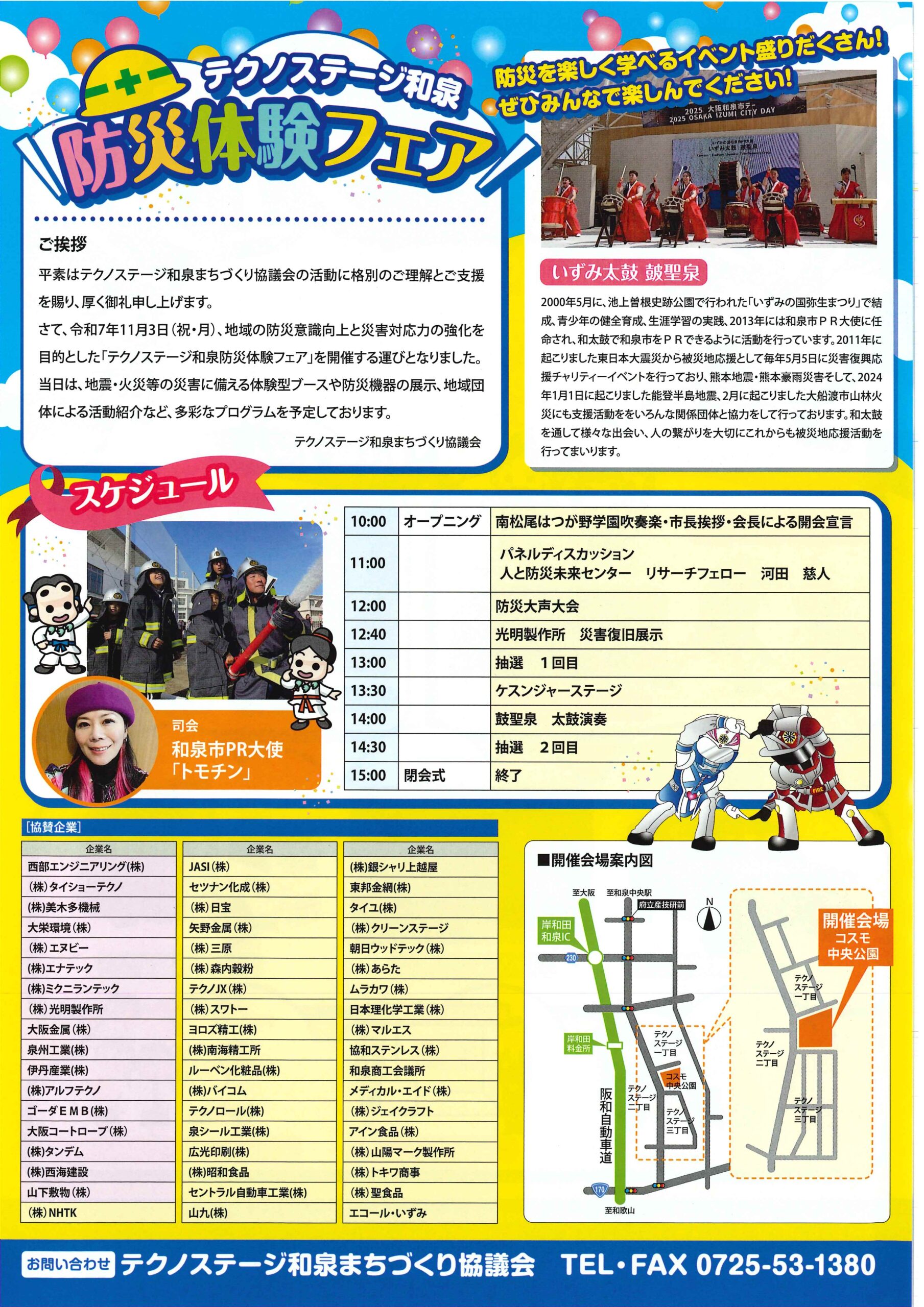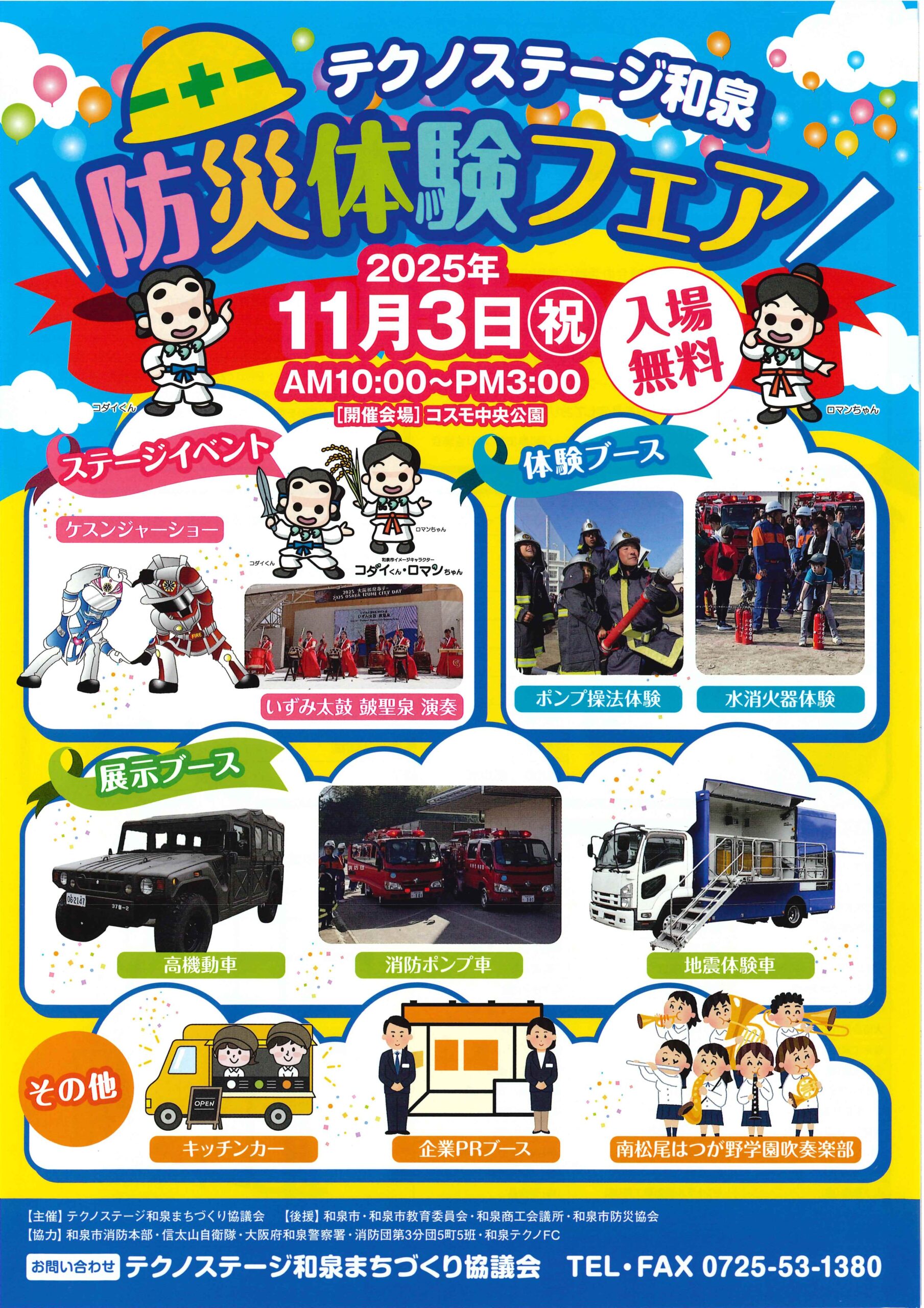 20251024 テクノステージ和泉防災体験フェア開催のお知らせ 11/3祝日にテクノステージ和泉防災体験フェアが開催されます。 主催はテクノステージ和泉まちづくり協議会となっております。 詳細はチラシをご覧ください。